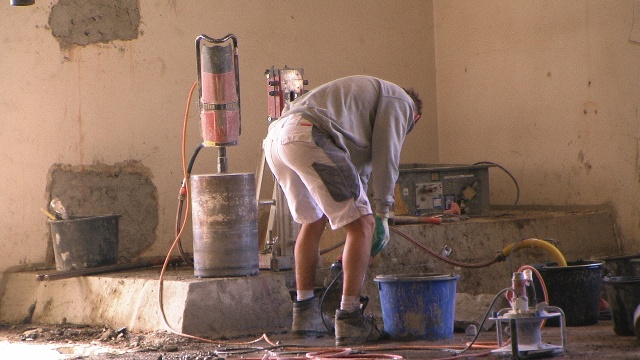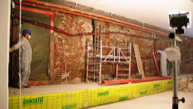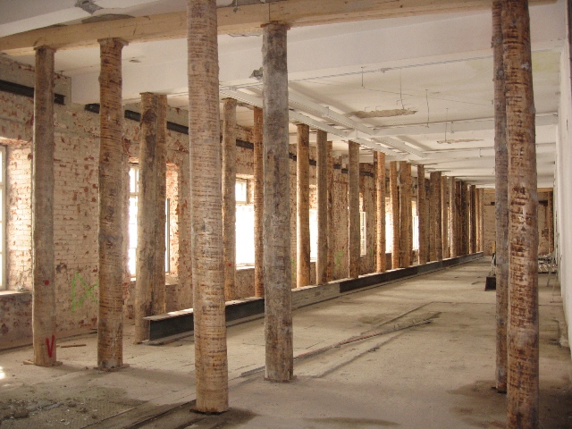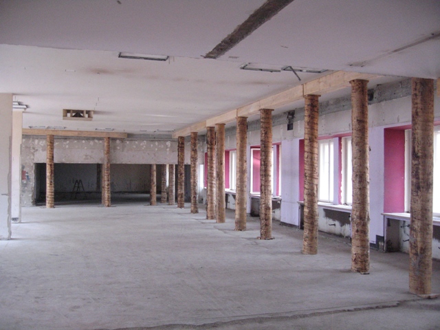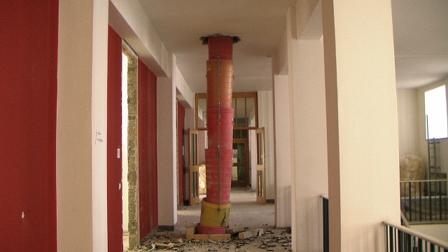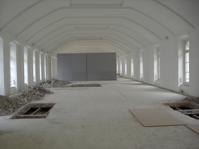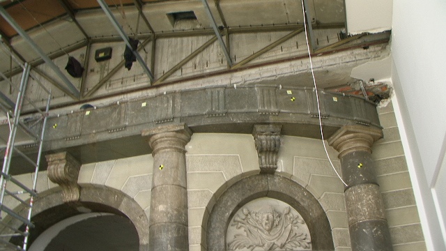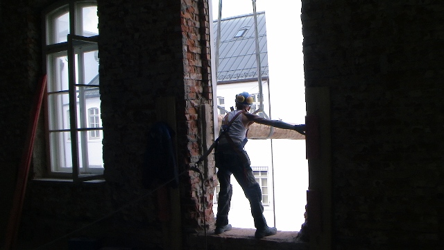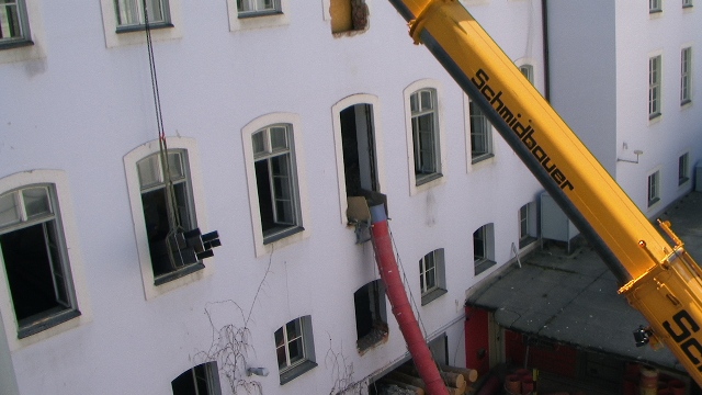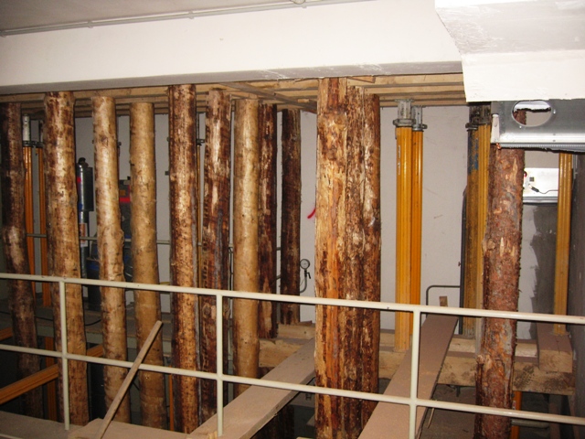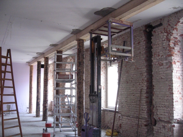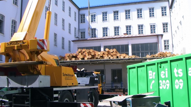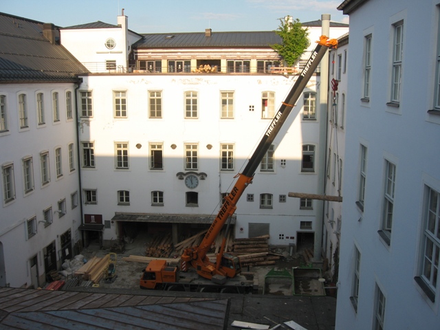 Da die gesamte Außenfassade zum Hofgraben erhalten wird, muss diese für den Komplettabbruch vom restlichen Gebäudebestand getrennt werden. Um dies statisch realisieren zu können, wurde entlang der Abbruchgrenzen eine „Ersatzaußenwand" aus über 680 Baumstämmen (Durchmesser 26 bis 30cm) mit Einzellängen bis zu 6,70 m aufgebaut. Im Zuge dieser Maßnahme wurden 328 Deckenfelder ausgetauscht, 55 m³ Kanthölzer, 110 m³ Beton für über 70 Einzelfundamente, 69 m³ Mauerwerk und fast 2,5 Kilometer Rundholz verbaut.