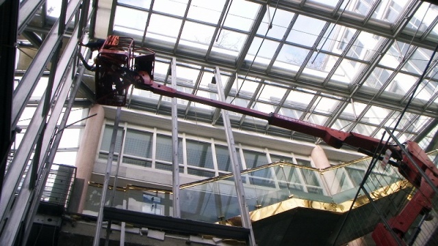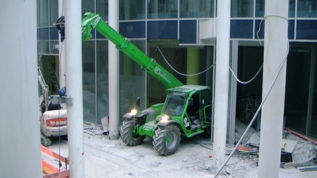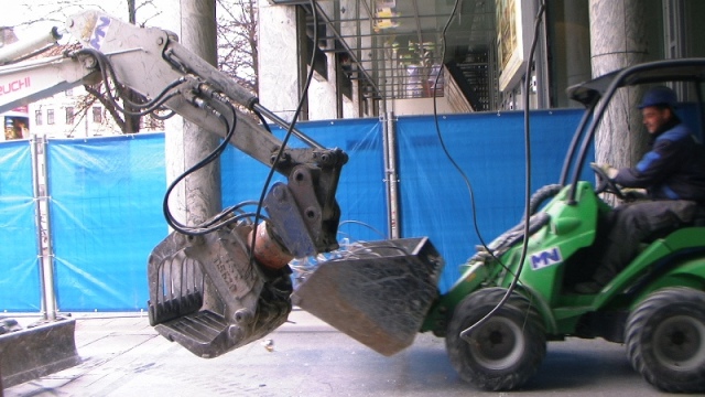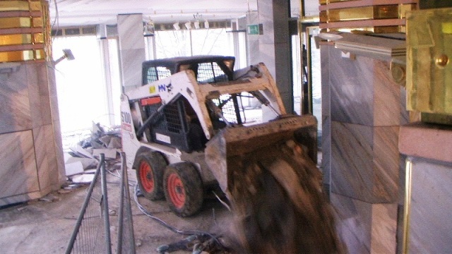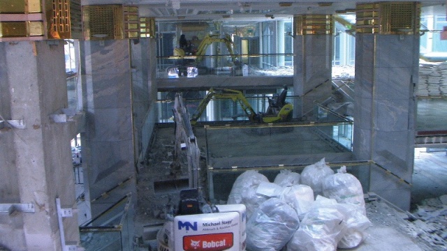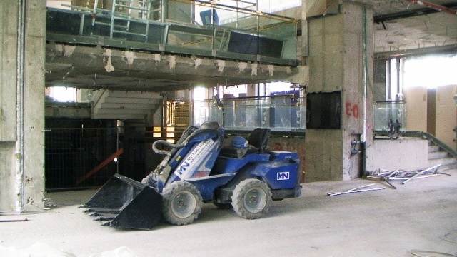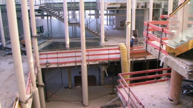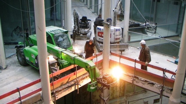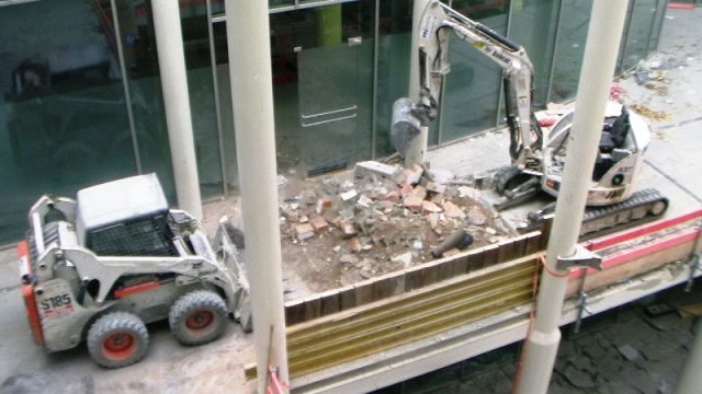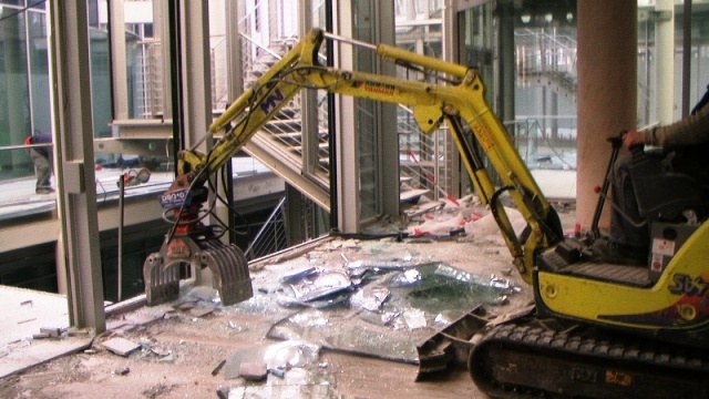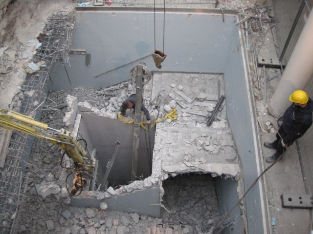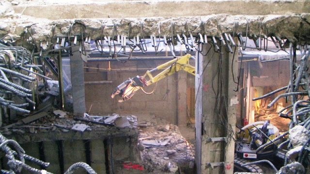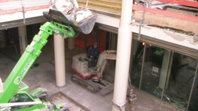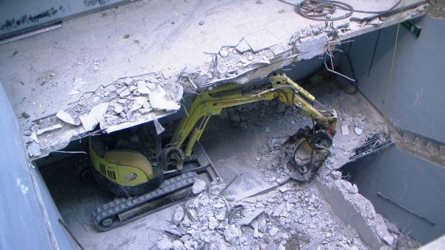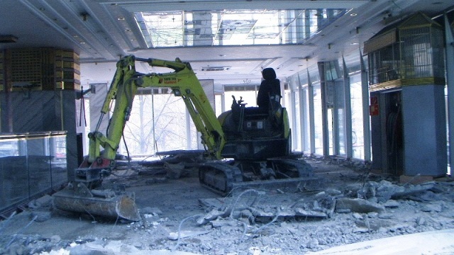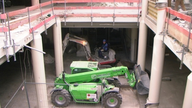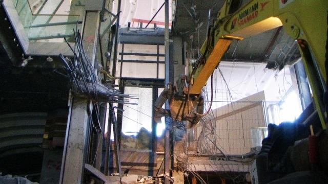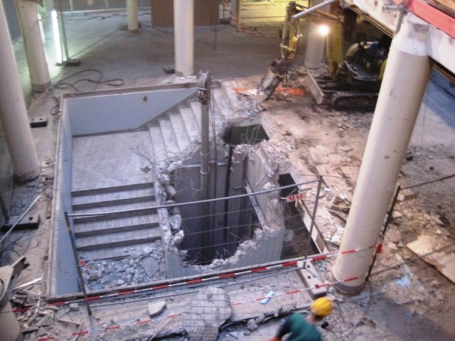 Der konstruktive Abbruch beinhaltet unter anderem etwa 1000 m³ Stahlbeton (hauptsächlich Decken) im Gebäude und erstreckt sich vom 4. Untergeschoß bis ins 3. Obergeschoß. Dabei werden natürlich Zug um Zug neue Decken erstellt um die Aussteifung des Gebäudes zu gewährleisten. Auf der Baustelle eingesetzt werden ca. 15 Klein- und Kompaktgeräte bis 7,5 to, darunter auch zwei Teleskopstapler, um das Abbruchmaterial aus den Untergeschoßen zügig nach oben zu fördern. Neben den sehr hohen Anforderungen an die Logistik stellt auch die Lärmvermeidung eine Herausforderung dar, da das Kino, Arztpraxen, Kanzleien und Redaktionen im Gebäude weiterhin genutzt werden. Deswegen erfolgt z.B. überall wo es möglich, der Abbruch von Massivbauteilen mit Betonscheren anstatt Hydraulikhämmern